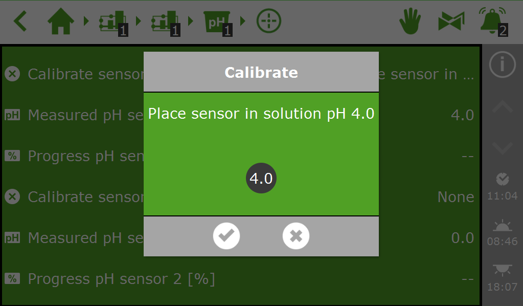 . W celu rozpoczęcia procesu kalibracji, wybierz czujnik (1 albo 2) z menu. Pojawi się widok podręczny wskazujący kroki do przeprowadzenia. Po zakończeniu tego procesu, zapisz zmierzone wartości kalibracji dotykając ikony zapisu. System wyświetli poprawne wartości pomiaru.